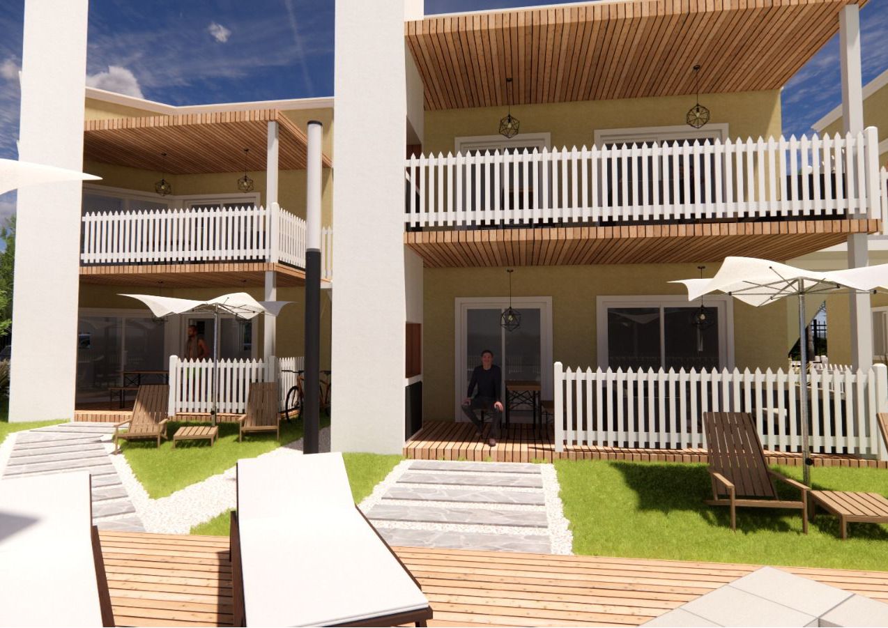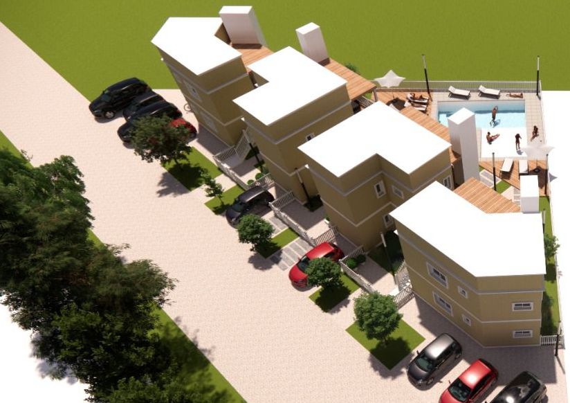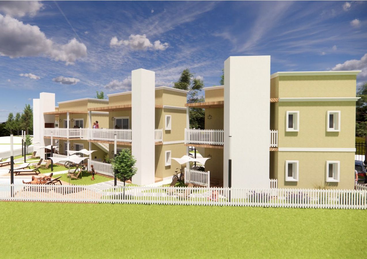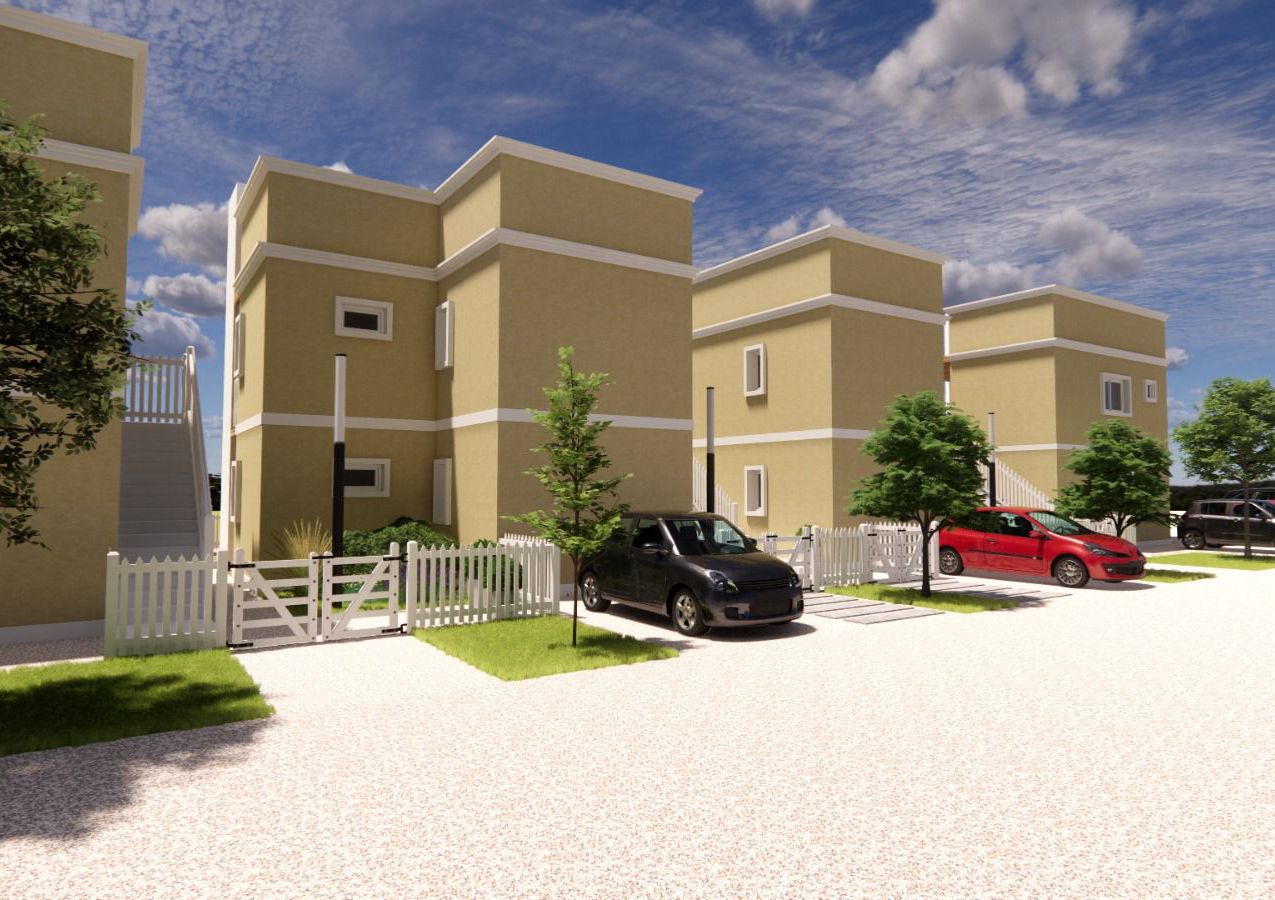 Vista superior renderizada de los departamentos y sus espacios exteriores.